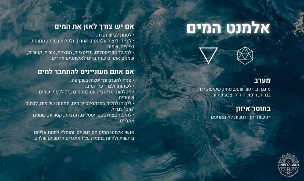 אחרי שניצוץ החיים הראשוני יצא לעולם (אש) , ואחרי שהתייצבנו ובנינו תשתית (אדמה), אחרי שלמדנו על הסביבה (אויר), הגיע הזמן לפתח את העולם הפנימי הרגשי. האלמנט הרביעי והאחרון שמופיע בגלגל המזלות ולא סתם-המים מכילים את הכל, את כל הזכרונות, רוב העולם עשוי ממים, הם מתגלגלים באין סופיות, מתאדים, יורדים בגשם, זורמים, משתנים (האלמנט היחיד שיכול להיות בכל מצב צבירה!) ומסתגלים (מתאימים את עצמם לכל כלי) ממש כמו הרגשות שלנו. מים אולי זה אחד האלמנטים הכי מסתוריים ומיוחדים, ולכן הכיוון של האלמנט הוא מערב-בשקיעה כשאור כובה ומתעוררים הפחדים שם גם הריפוי קורה. זה הוא גם כיוון של הודיה-מומלץ להודות בשעות השקיעה, על כל הדברים הטובים והפחות טובים שקרו בכל יום. המים כל כך חשובים, בכל מקום שיש בו מים יש חיים, עובר נמצא בתוך מים, ואנחנו עשויים ממים, אחרי הגשם הצמחים צומחים, המים מנקים אותנו, מטהרים, ניתן להפיק אנרגיה וחשמל מהעוצמה של המים. היום הם נגישים לנו אך בעבר התאמצו מאוד ובנו תעלות, ועד היום יש מדינות שחסר להם מים, לדעתי בחברה של היום לא מעריכים מספיק את המים, חיות למשל נודדות עשרות קילומטרים כדי לחפש מים.כולנו תלויים במים ובלי מים נקיים אנחנו בבעיה. אומנם מים הם רכים אך הם כוח אדיר, מספיק מים יכולים לשבור ולהרוס, ובמשך מספיק זמן מים יכולים לשחוק סלעים, מה שמלמד שאפשר לעשות שינויים גדולים בסבלנות ורכות, המים מלמדים שרכות יכולה להיות כוח כי היא לא נשברת בקלות.אלמנט המים בגלגל המזלות מתחיל במזל סרטן, מזל קרדינלי הכי רגשי בגלגל, משנה רגשות במהירות, ממשיך בעקרב, וגלגל המזלות מסתיים בדגים שזהו המזל שיש לו פוטנציאל להכל, מכיל את הזכרון הקולקטיבי ואת כל המזלות שהיו לפניו. אם יש צורך לאזן מים: *לפנות לכיוון מזרח. *לצייר וליצור אלמנטים אחרים ולתלות במרחב-תמונות וציורים, שמות. *להיעזר בקריסטלים, מדיטציות, תמציות, צורות, קטורות, שמנים אתרים שמחברים לאלמנטים אחרים. אם אתם מעוניינים להתחבר למים: *פניה למערב ומדיטציה בשקיעה. *לשתות! ולברך על המים. *מקלחות, מדיטציה עם כוס מים ביד, לדמיין שמים שוטפים. *ליצור ולתלות במרחב-לצייר מים, תמונות של מים, לכתוב "מים" בגדול. *להיעזר בצורה, בקריסטלים, תמציות, קטורות, שמנים אתריים. עוד על אלמנט המים: *צורה-עֶשְׂרִימוֹן משוכלל (נקרא גם אִיקוֹסָהֶדְרוֹן) *חיה-דוב*עונה-סתיו, שלכת (ניקוי) *אלמנט נקבי, יין*מים מקושרים לירח (גאות ושפל ומחזור האישה) *תקופה בחיים-בגרות*צבע-שחור*צ'אקרה-סולר פלקסוסאנשי אלמנט המים הם רגשיים, ומומלץ לפנות אליהם ברגשות ולהיות בחמלה על האתגרים הרגשיים שלהם.*חשוב לי לציין גם שההתעסקות עם ארבעת האלמנטים יכולה להיות מבלבלת, יש המון שבטים ילידים מסביב לעולם וכל שבט מייחס איכויות קצת אחרות לכל יסוד אך הרעיון הבסיסי הוא דומה, אז יכול להיות שכאן תקראו משהו מסוים ובמקום אחר תחשפו למידע קצת שונה, אני משתפת ממה שאני למדתי במהלך השנים ומה שמרגיש לי הכי מדויק… קישורים למידע נוסף מצורפים בתגובה*למעוניינים ניתן לרכוש ממני שמנים אתריים איכותיים של דוטרה או תמציות שתומכים באיזון או בחיזוק האלמנטים, מי שמעוניין להעמיק אני עושה סדנאות על כלים לחיים דרך ארבעת האלמנטים❤️
